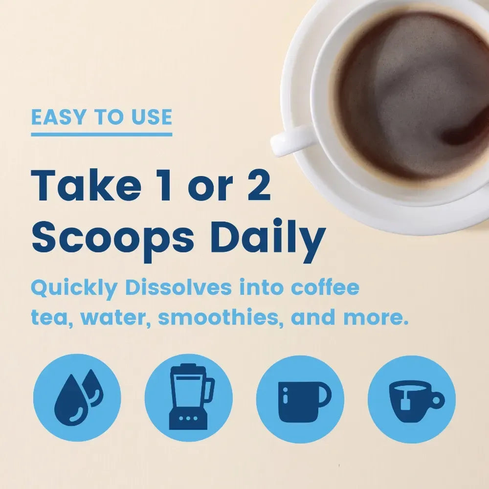 Mix 1-2 scoops thoroughly into 8 fluid ounces of hot or cold liquids. Dissolves clump-free with stirring. For best results use multiple scoops daily.